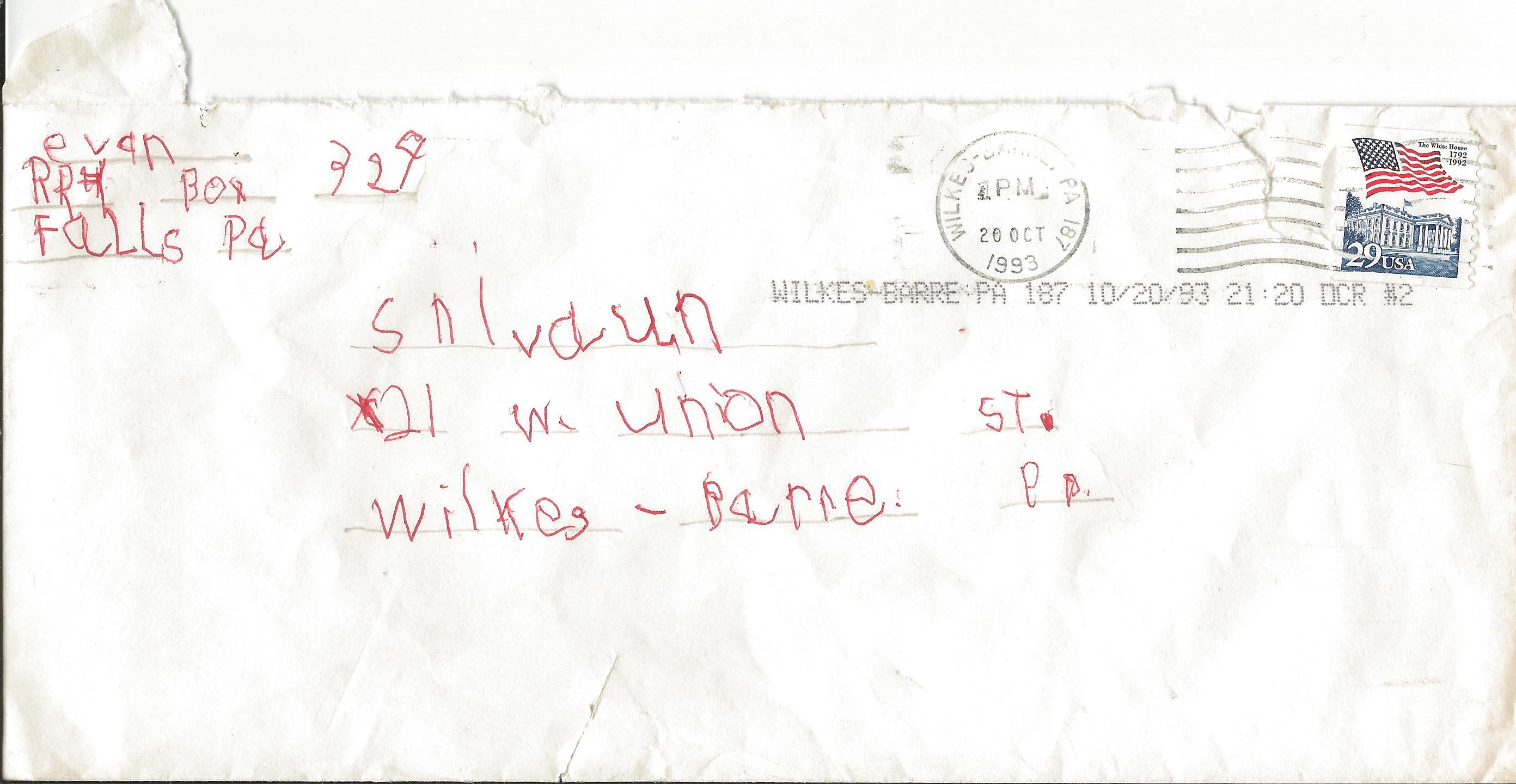 Envelope from Evan at 7 years old, sent from his dad’s house,the contents long gone, postage 29cents, addressed in red ink, simply to “Shivaun, 21 West Union Street, Wilkes-Barre,” with light pencil marks to keep his writing writing in line