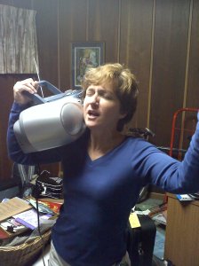 So what do you do when you have 8 boom boxes? You rock out! This is me demonstrating. And Yes, the place is a mess. We haven’t really moved in yet, although we have brought many car and Mariner loads of stuff down, most importantly our bed, the cat and the computer. We are sleeping here with daily trips to the old place.